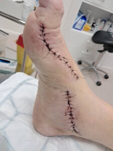 Toisen viikon aluksi kävin haavahoitajalla haavalappujen vaihdossa. Oli vaikea jopa katsella omaa tikkientäyteistä jalkaterää. Paras tieto toki oli, että haavat olivat kunnossa. Ja oli ihanaa saada uudet, puhtaat laput edellisten veristen haavalappujen sijaan.