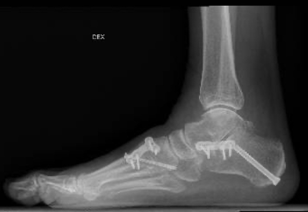 Olin tietysti hyvilläni, että leikkaus oli onnistunut hyvin. Röntgen-kuvia iloisena esitelleelle ortopedille sanoin, että leikkaus siis onnistui, mutta potilas kärsii. Jäin miettimään, olisiko ortopedi voinut muokata jalkaterää vähemmän ja silti saada riittävän hyvän lopputuloksen. Olen ymmärtänyt, että esimerkiksi ensimmäistä tarsometatarsaaliniveltä ei aina luuduteta, kun rakennetaan uusi jalkaholvi. Tämä tehdään vain, jos jalkapöytä on liian liikkuva/löysä. Juuri tämä luudutusimplantti on aiheuttanut pahimmat kivut. Varmaankin se oli silti minun tapauksessani järkevää asentaa. Lisäksi kantapää oli asennettu uudelle paikalleen (kahtia sahauksen jälkeen) lyömällä naula sen läpi ja kiinnittämällä levy sen sivulle. Tämä levy näkyy osittain ao. kuvan alareunassa.