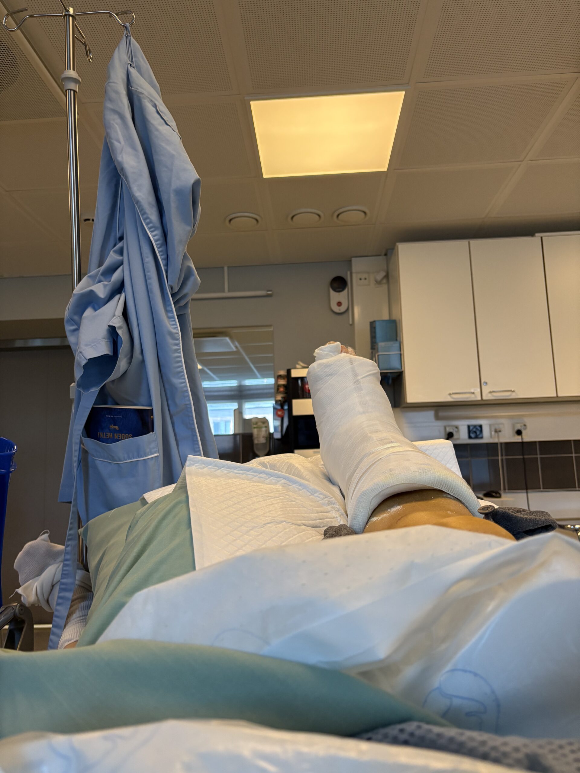 Suurin yllätys kahden päivän osastolla oloaikana oli joutuminen täysin sänkypotilaaksi. Sain oman huoneen omalla kylpyhuoneella, jota en päässyt ollenkaan käyttämään. Jalkaa oli pidettävä koholla 24 tuntia vuorokaudessa. Alusastian käyttö tuli tutuksi. Ei sitä osaa arvostaa itsenäisiä WC-käyntejäkään ennen kuin ne menettää.